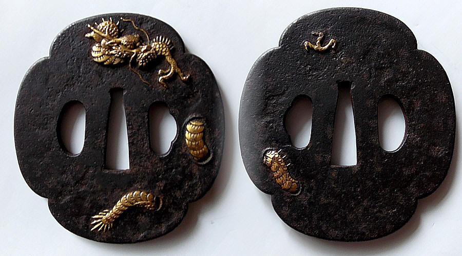 гарда клинка цуба изображает дракона, прогрызающего железо